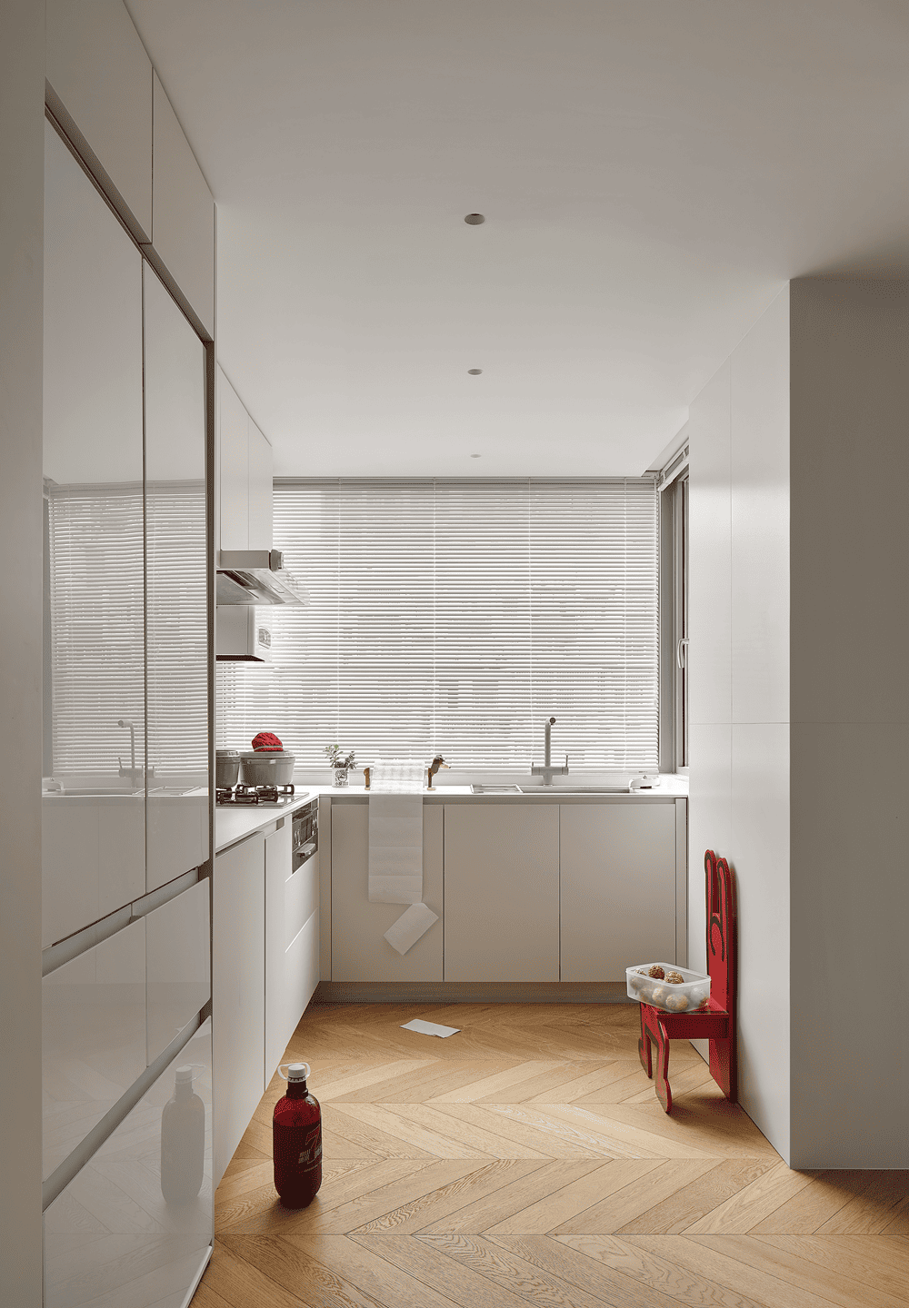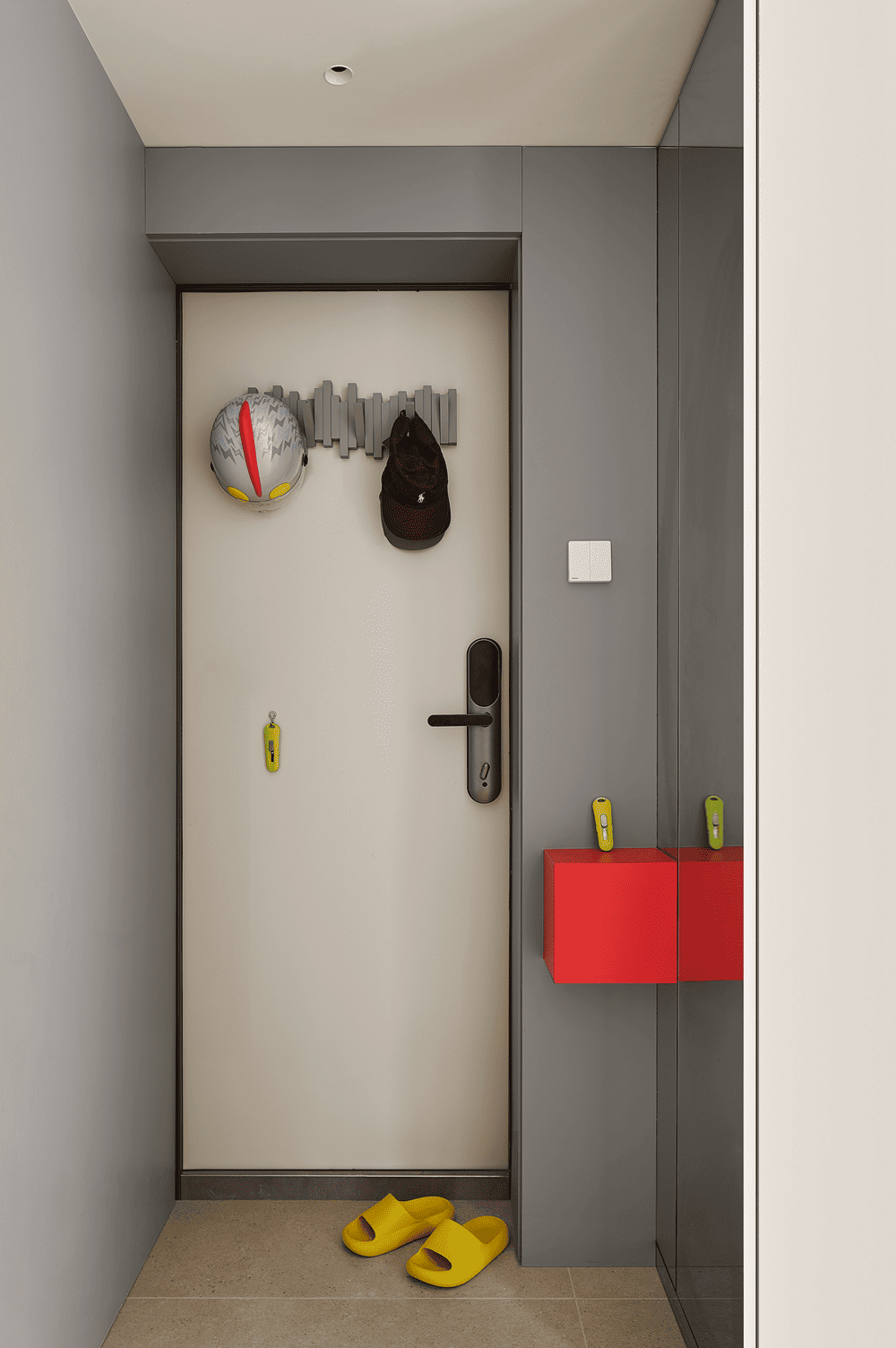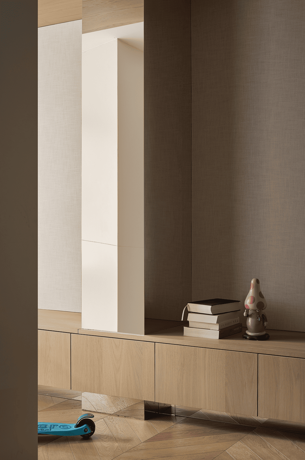 Behind the door is a quiet corner where time has stopped, with a low saturation entrance that exists in a very low posture in the space. It is stored behind a mirror, and the practicality of multi child families starts from entering the house.
