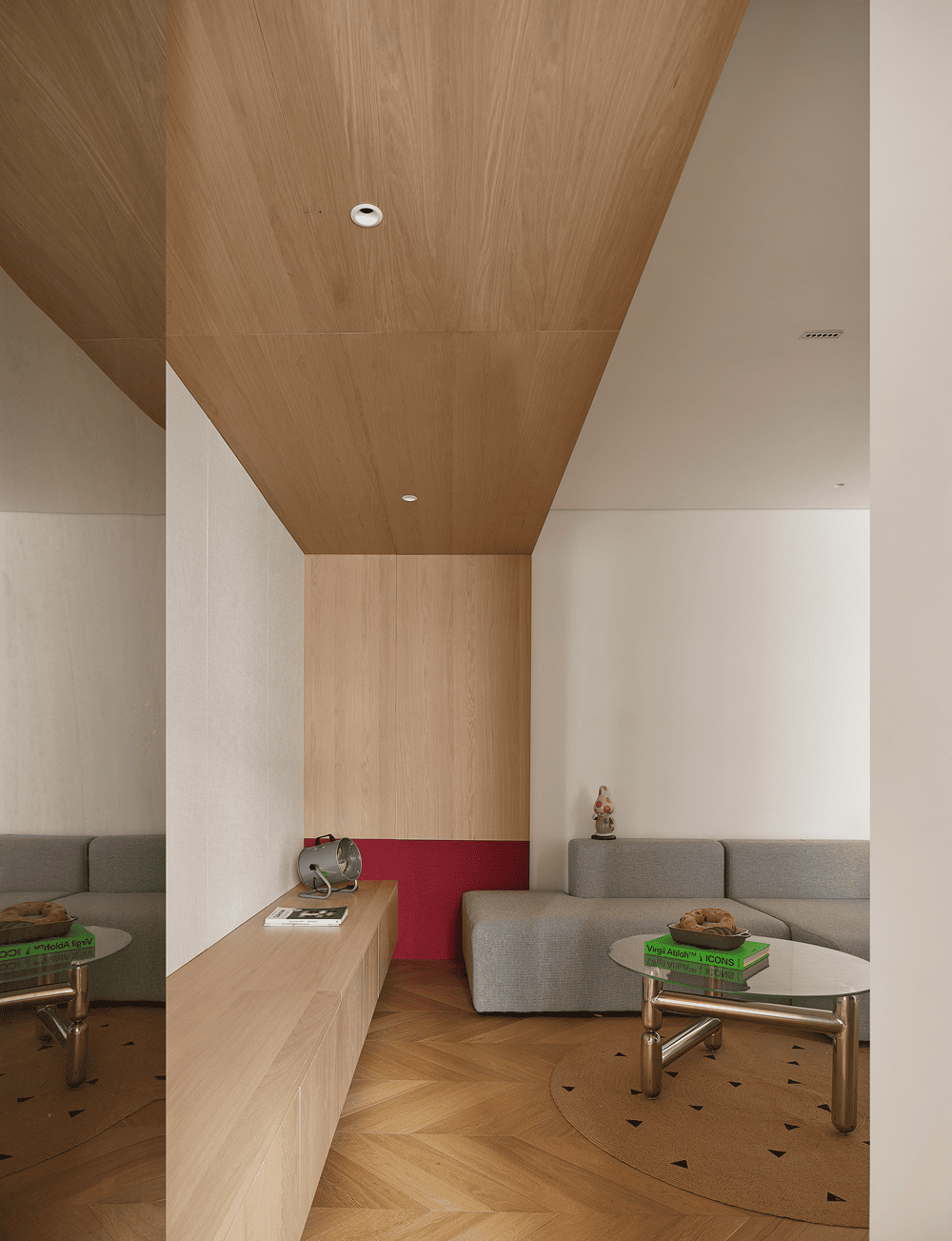 木饰面分割出的不仅是视觉形态,功能处也在此割据,长长的座椅延伸至客厅的尽头。孩子们玩耍与嬉闹,黄昏的云雾中,升腾起的是家人的温馨。