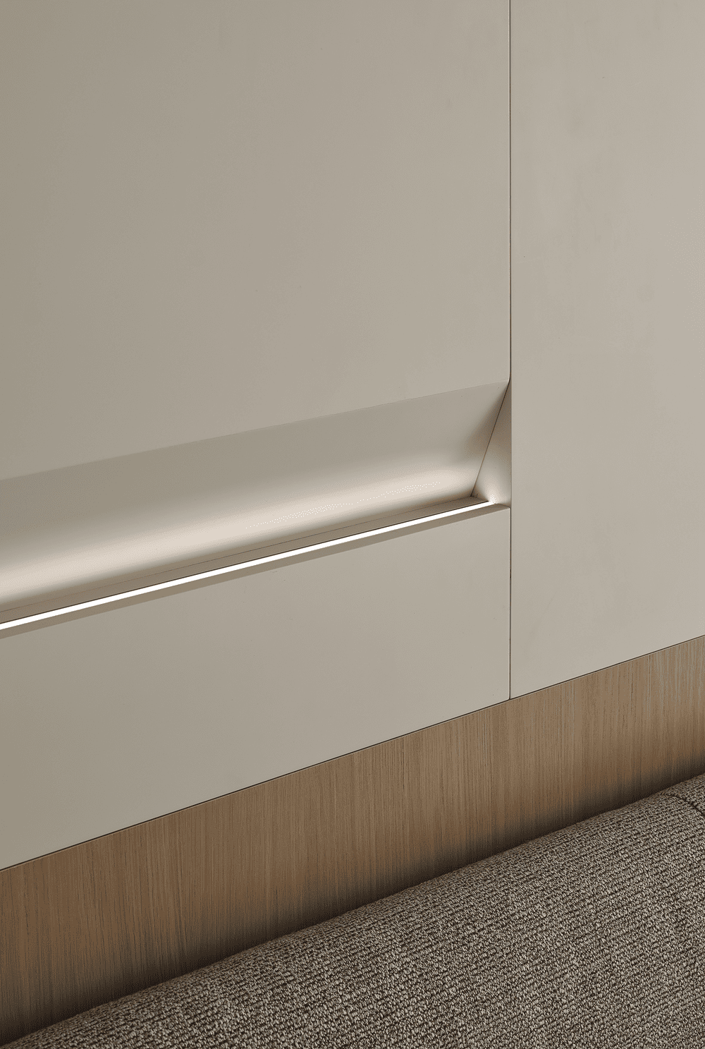 木质的床头与外层空间呼应,不再是单独于场域的岛屿,将光线暗藏在凹槽处,柔和的光雾充斥在此间,为光线提供了引导。