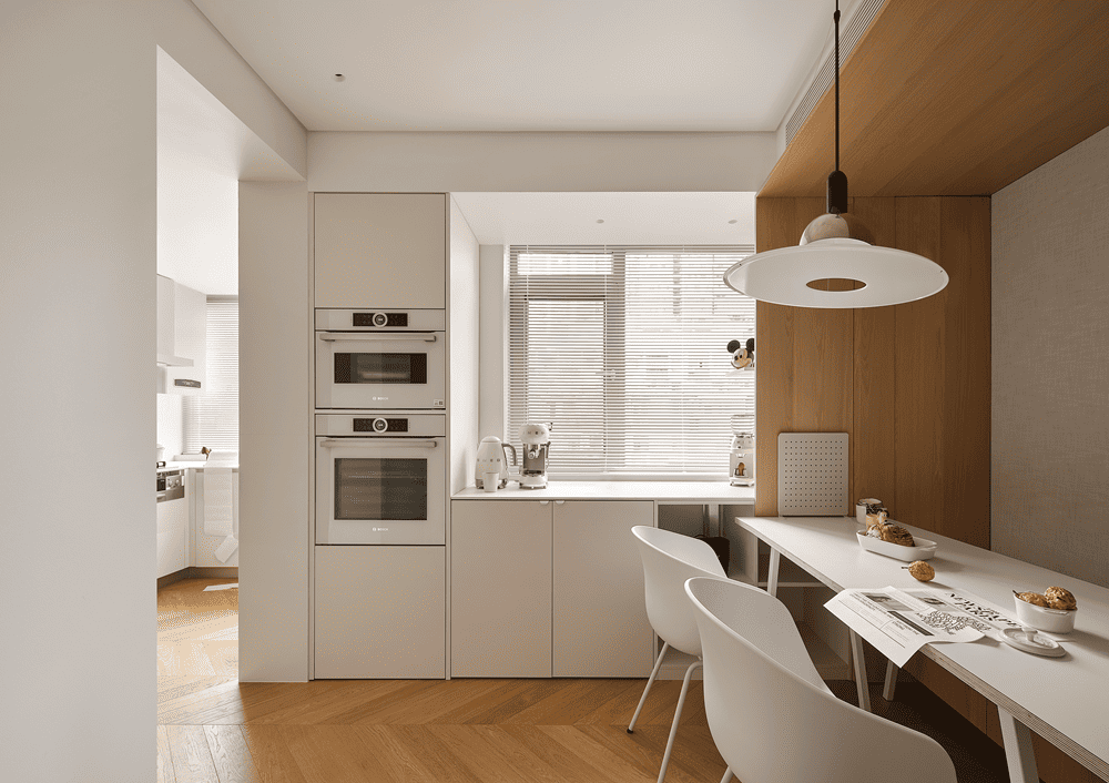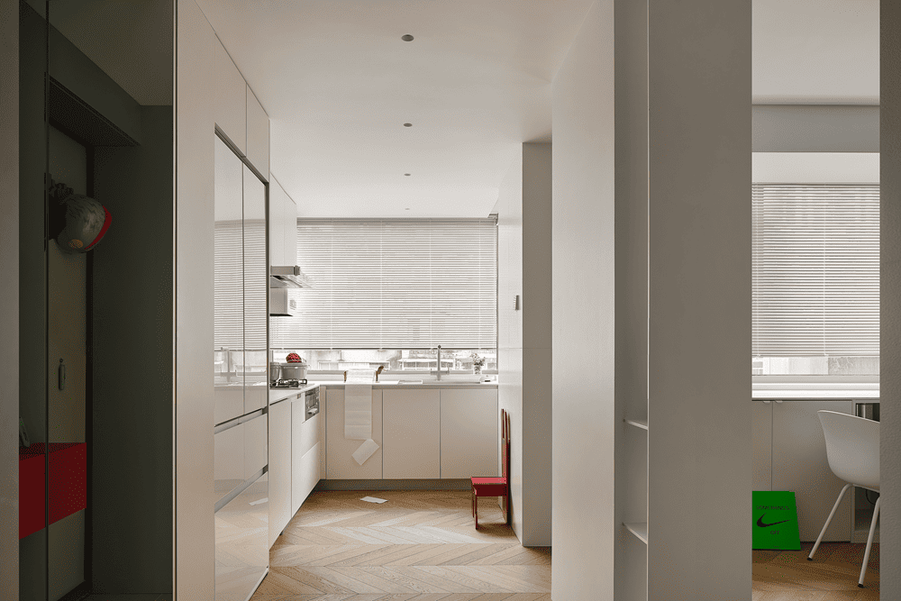 The dining area guided by the openings on both sides of the wall is the second largest activity area in the space. The designer transformed the entire space into a storage space, interpreting the comfort and freedom of a new era family, with simple lines weaving through the entire space. The load-bearing column is wrapped in mirror stainless steel, utilizing the characteristics of the mirror to amplify the entry of light.