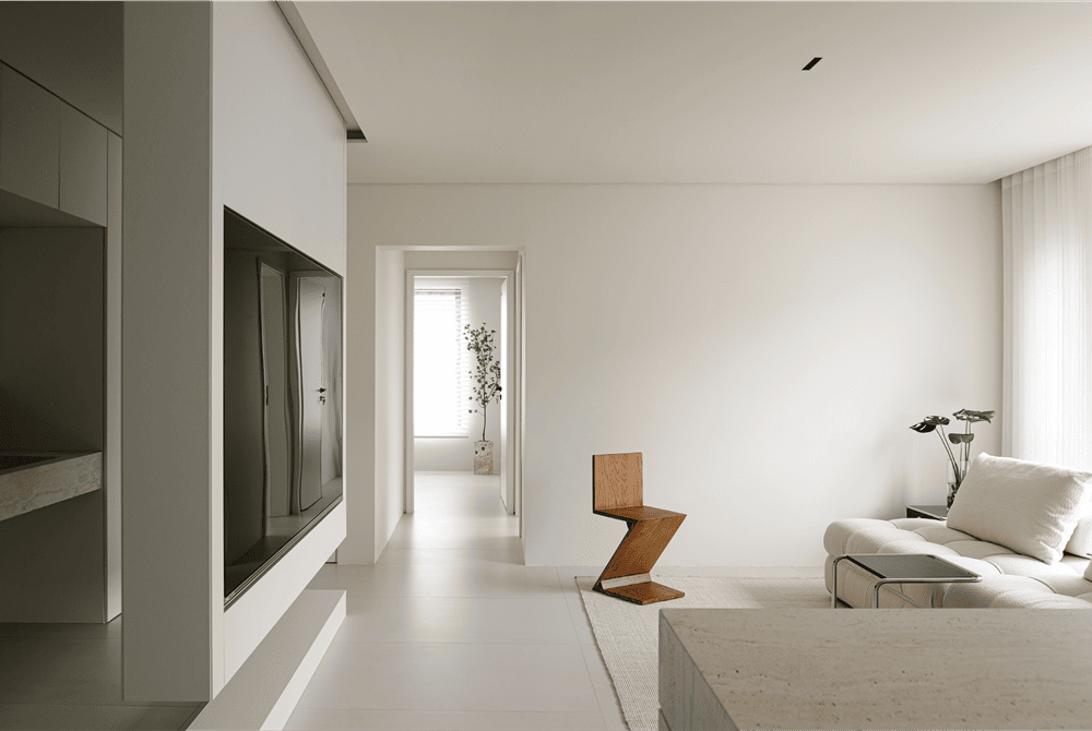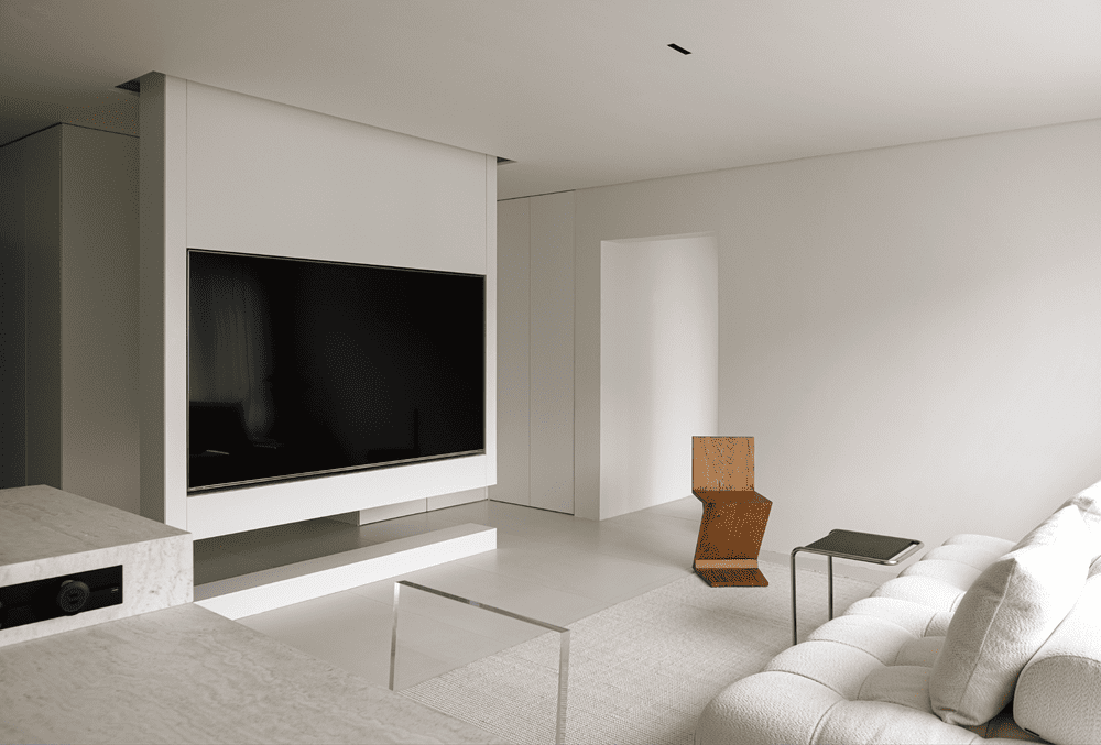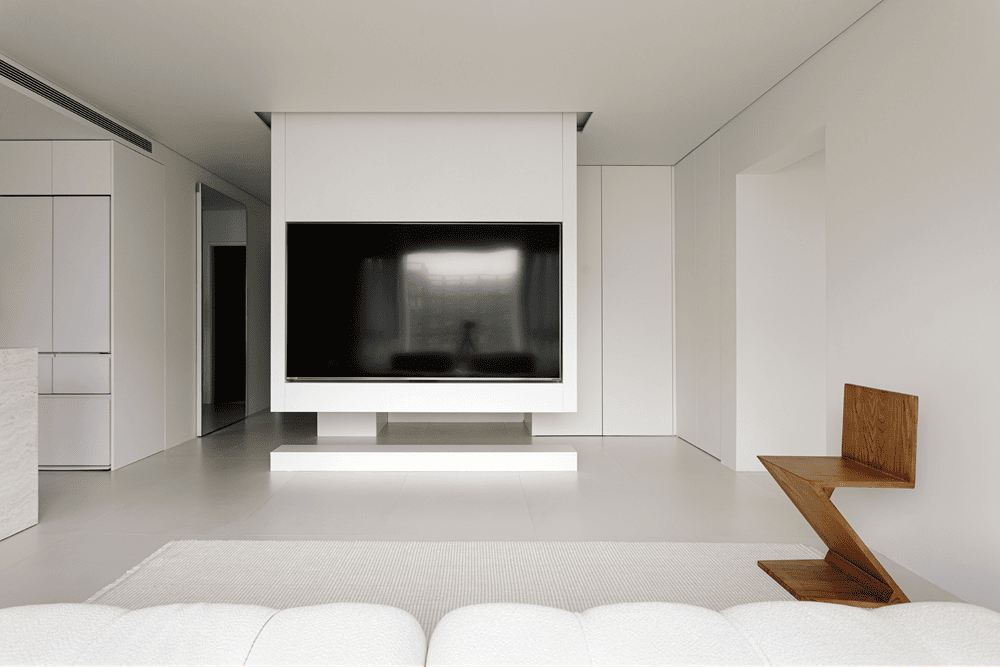 The overhanging TV cabinet embeds screen on one side, and store on the other side to hide equipment and wire, ensure the neatness of the space. The overhanging cabinet creates diverse circulations and changeable living scenes.