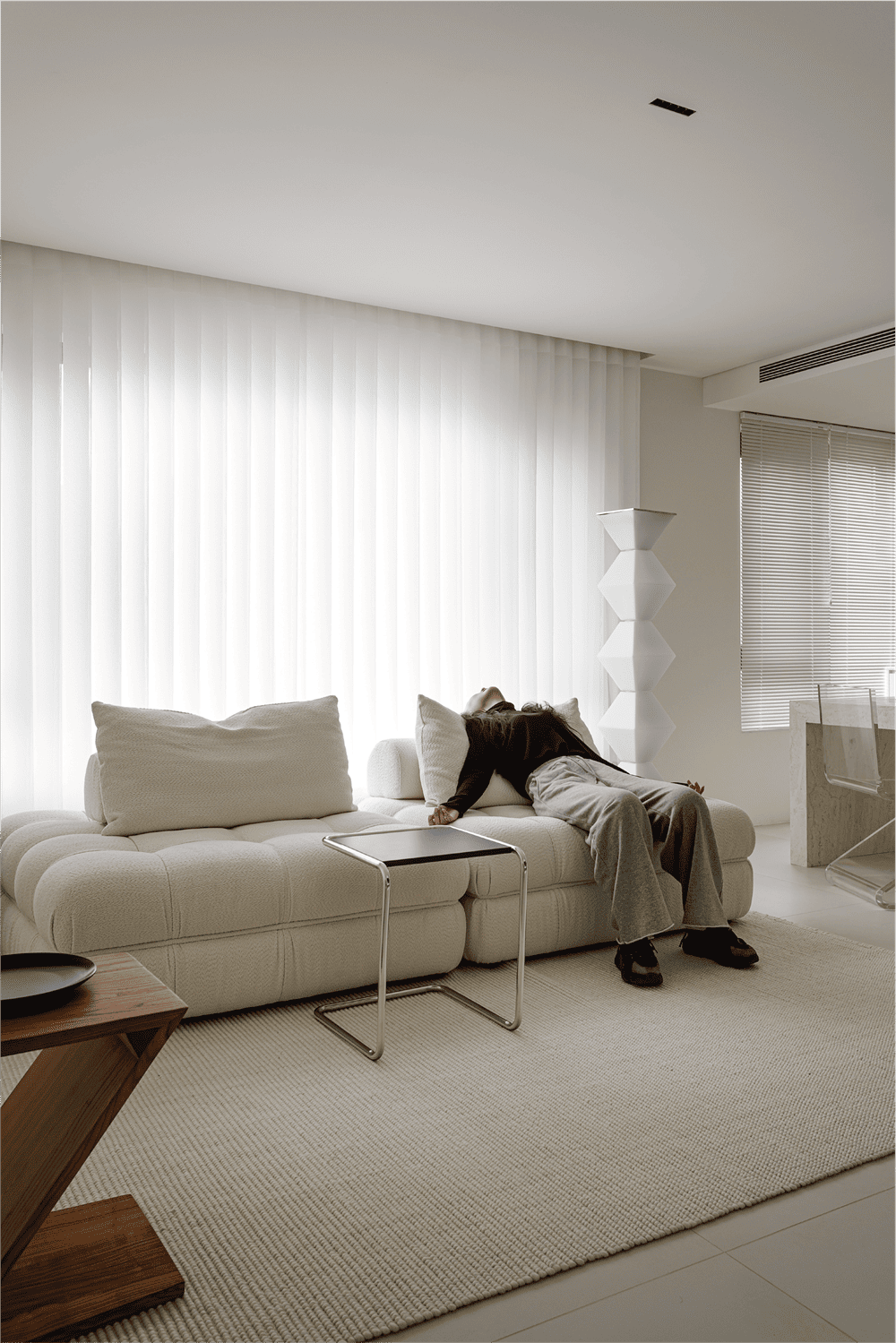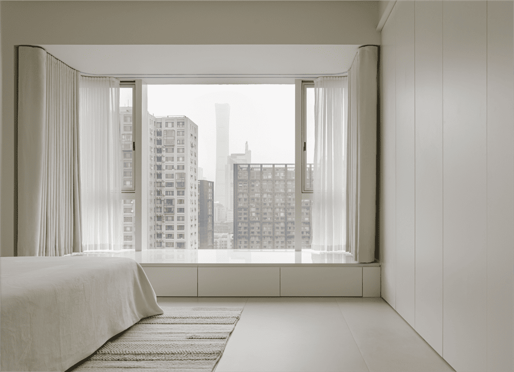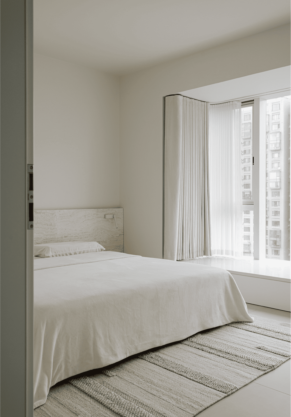 We relocate the bedroom door for more storage space. The balcony of the bedroom has been changed into floating window, with storage under the countertop. Overlook the city view by leaning against the window. The bedroom address pure atmosphere, keep simplicity and tranquility.