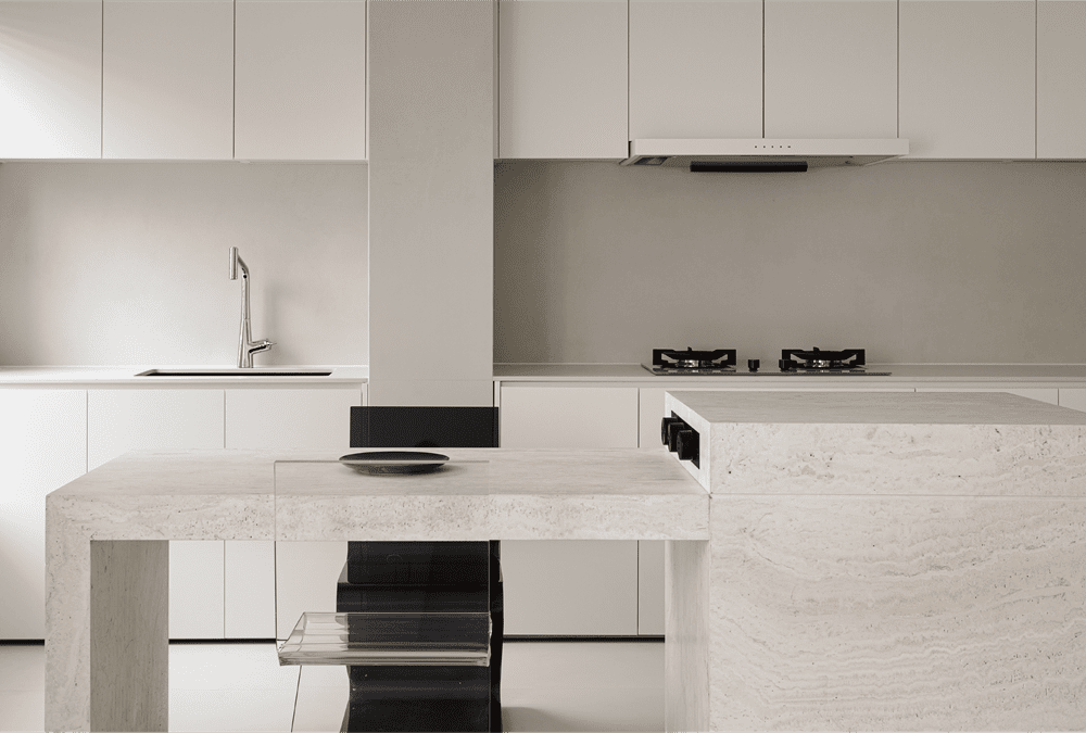 The dining table and island are made of beige stone. The surface is sealed to avoid oil penetration. The apartment adopts with whitish color and natural stone for a sense of warmth and tactility.