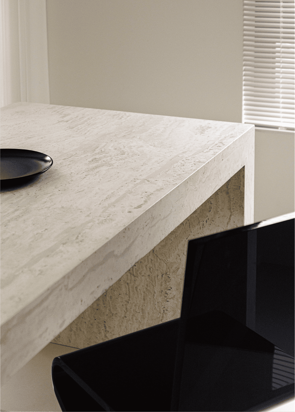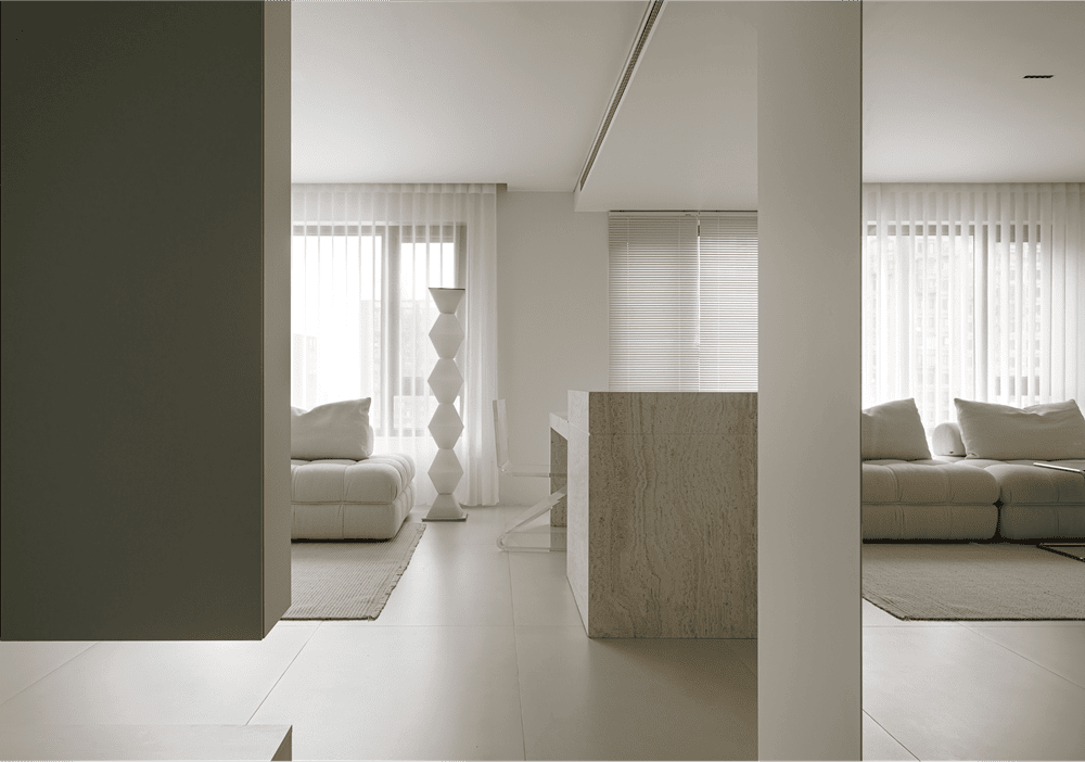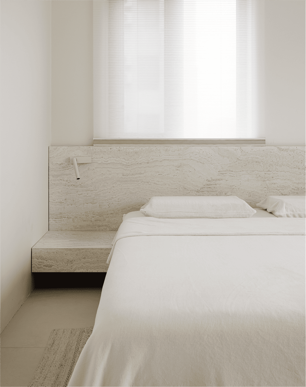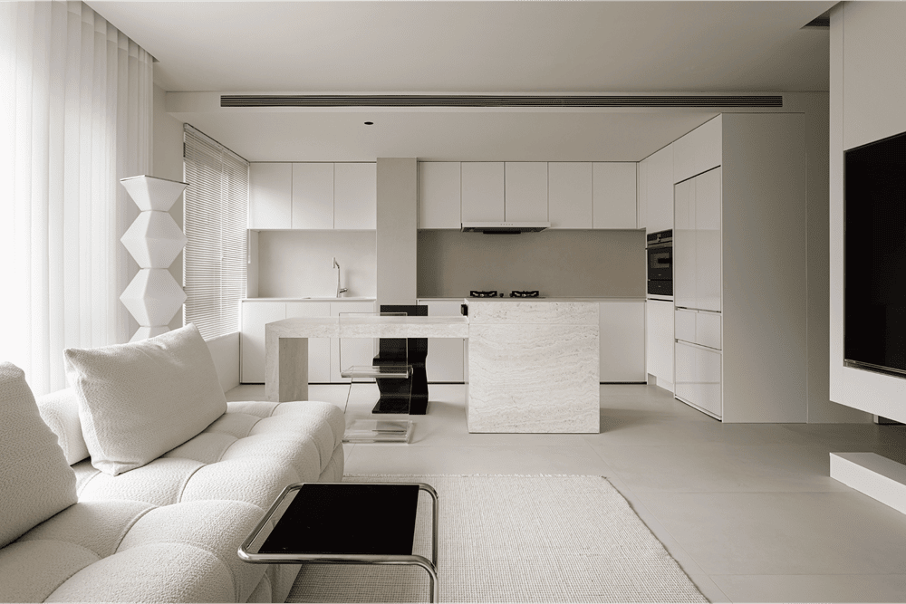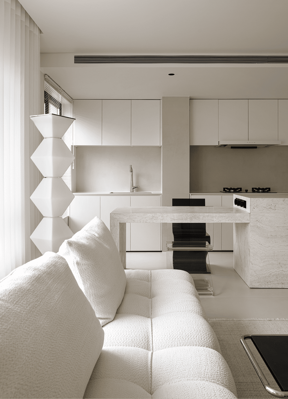 餐桌、岛台由米色超白天然洞石定制而成,表面封洞处理,避免油污的渗透。整个居室以白色打底,搭配天然石材,增添了空间的温润感、肌理感。