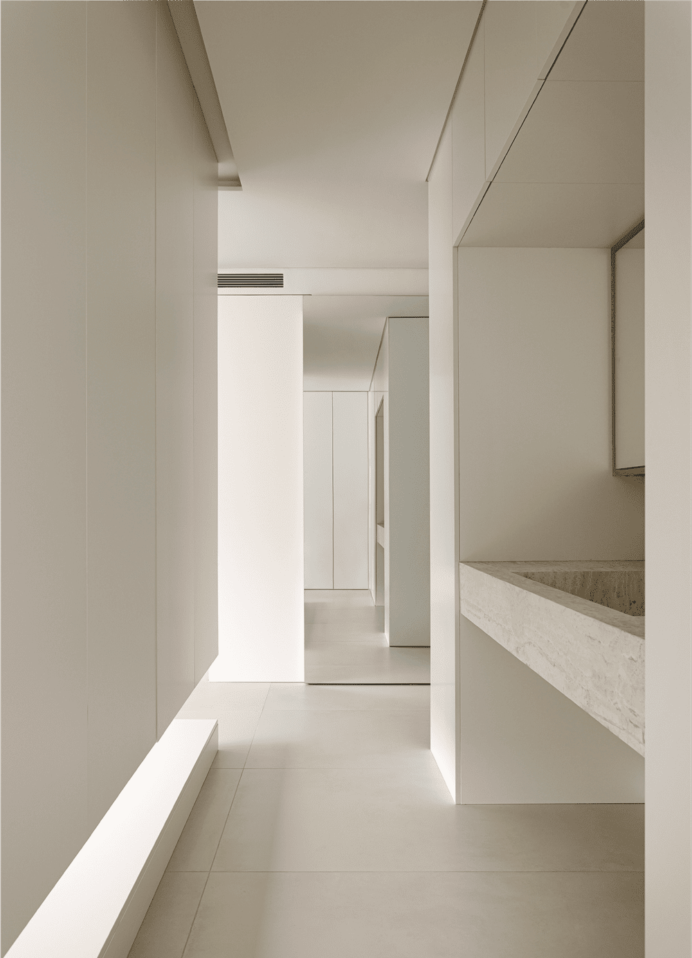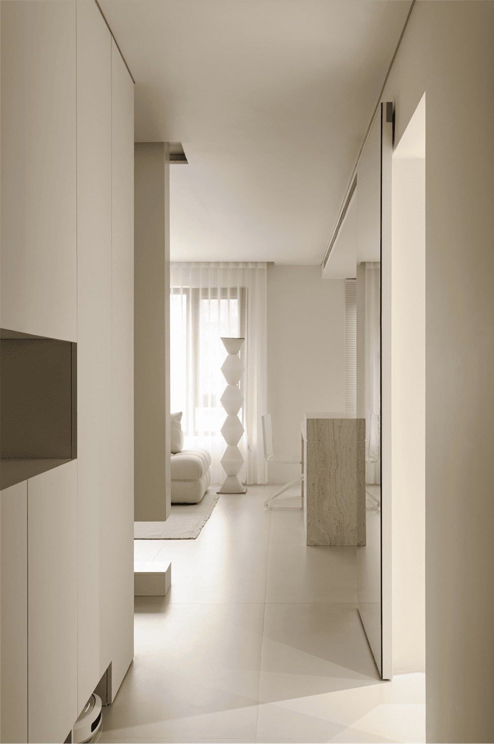 入户后,一侧为玄关柜,存放衣物;一侧为三分离卫生间,镜面幽灵门节省开启空间,同时可作为穿衣镜,为走廊起到视觉延伸的作用。