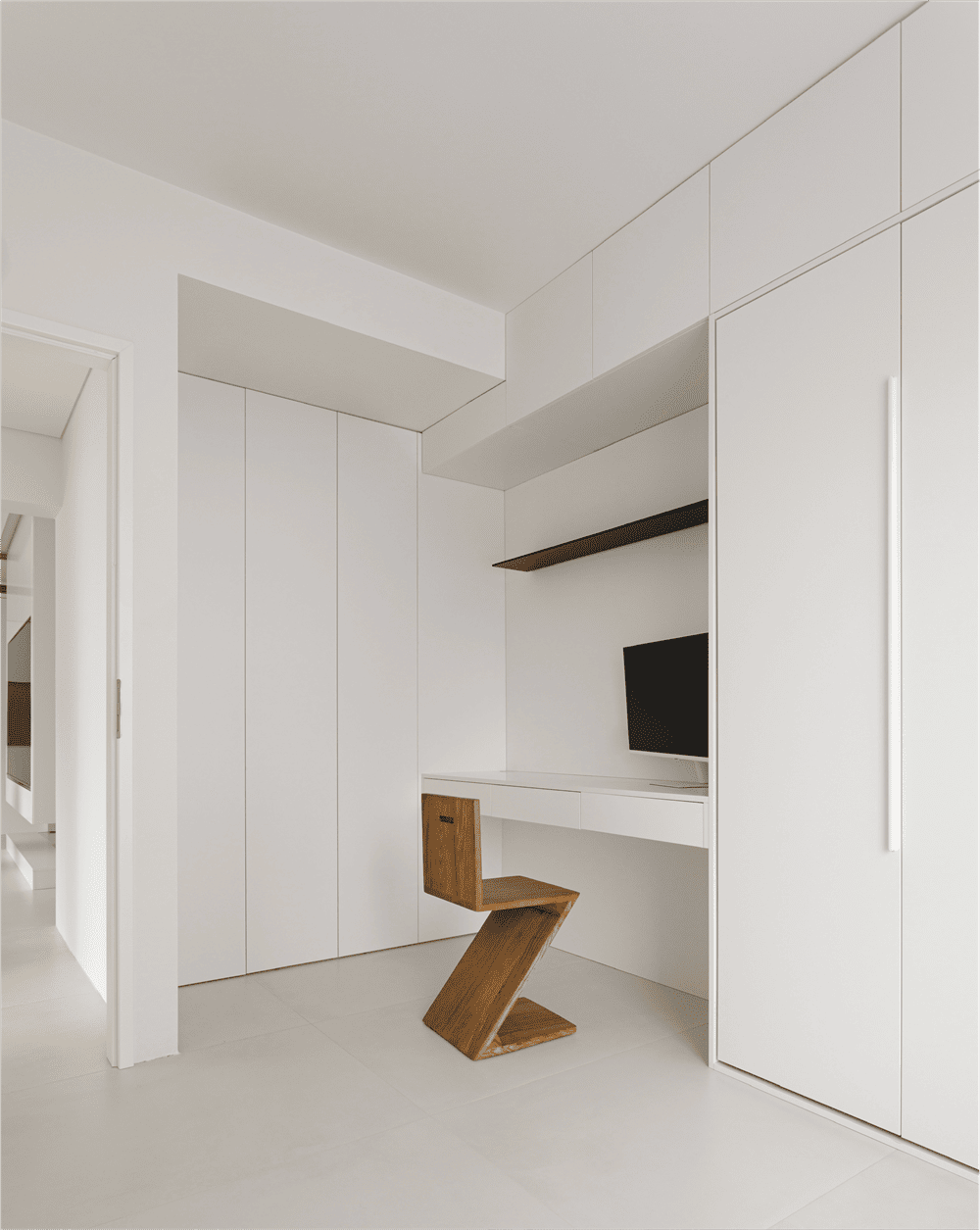 The guest room can transform into an independent study by adding working desk, provide opportunity for working from home. The space conceals storage and folding bed, provides convenience for families and friends stay overnight.