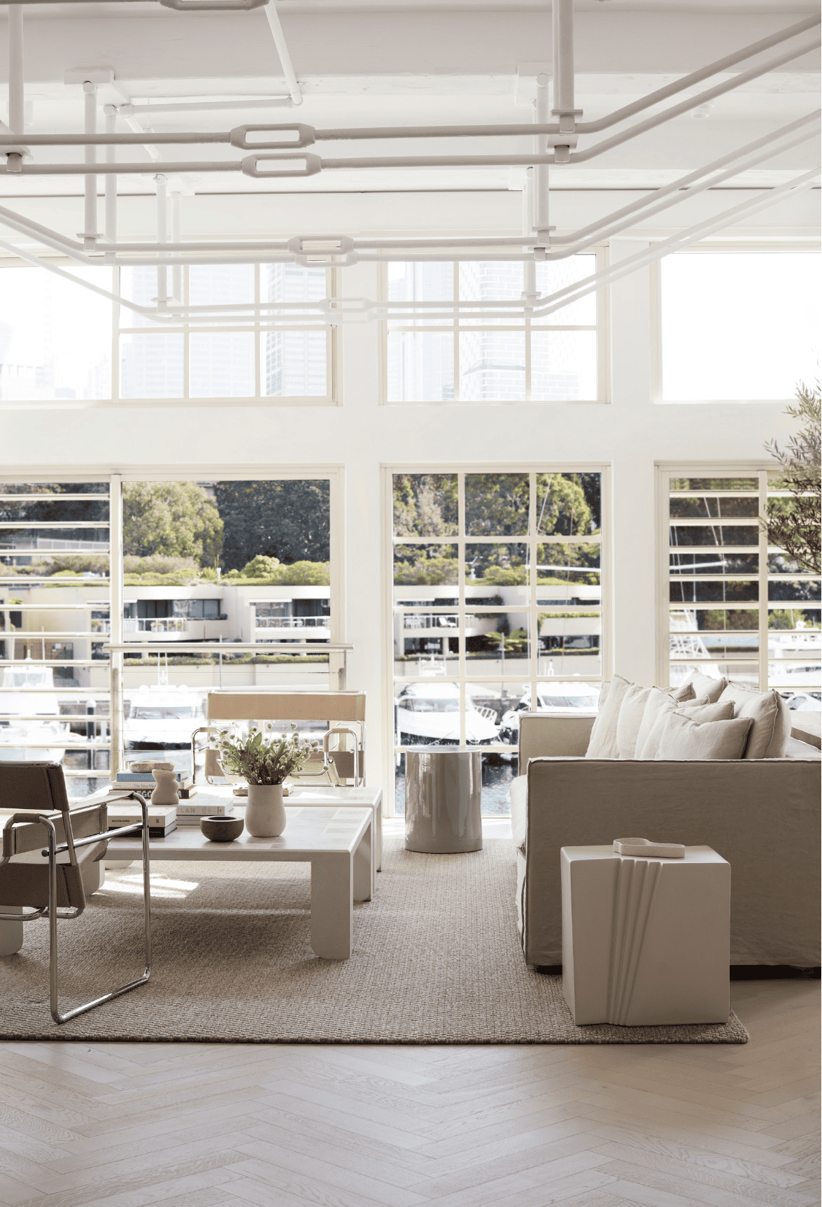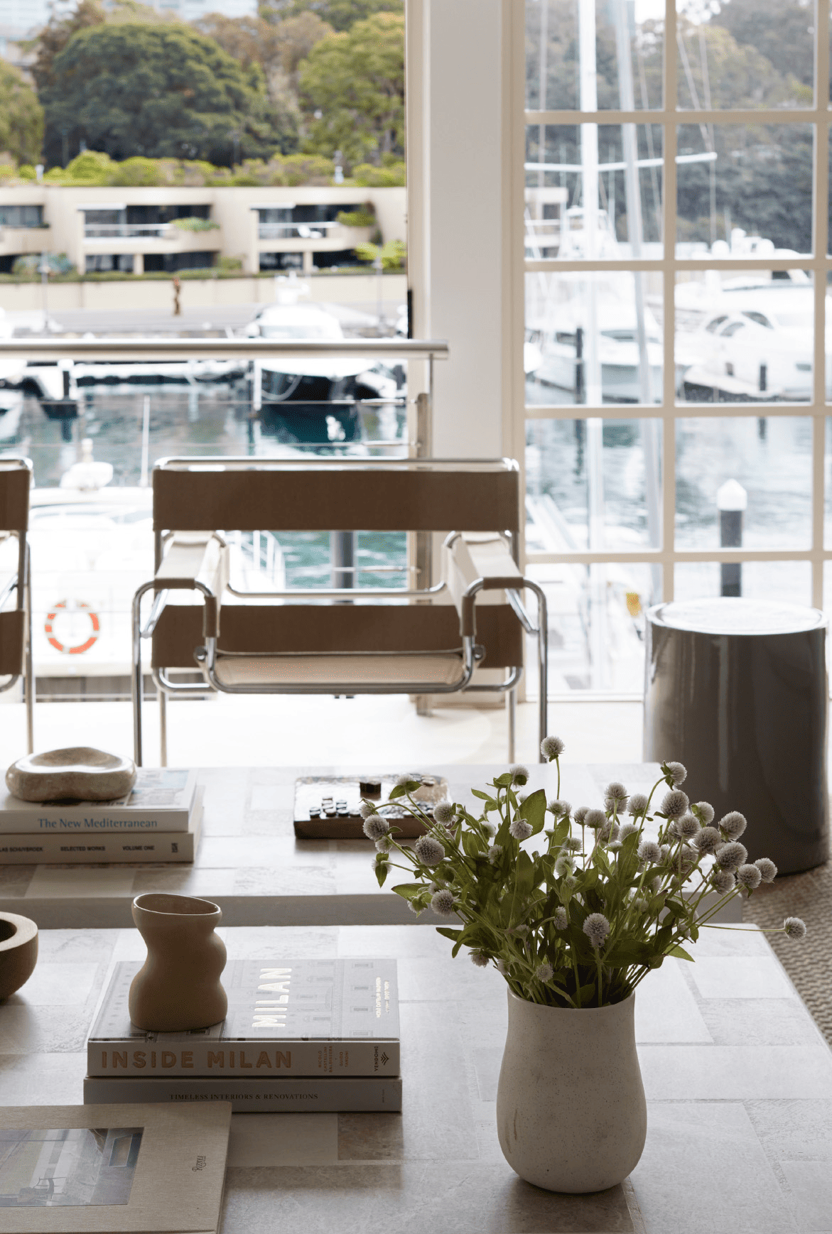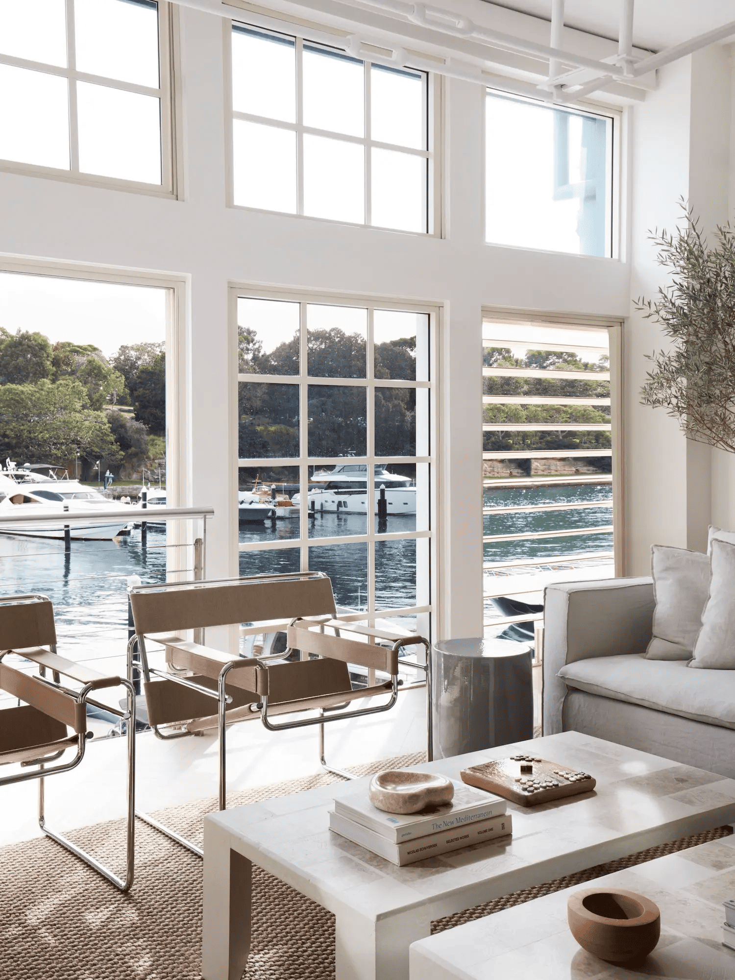 These materials collectively establish a neutral yet warm backdrop, effectively drawing the external harbour scenery into the interior.