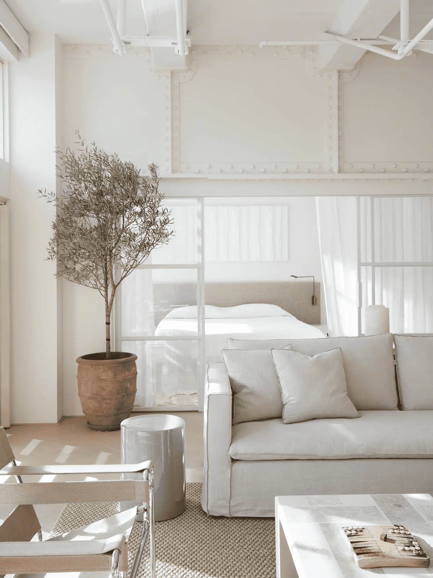 正如事务所联合总监Jo Lawless所言:“客户希望这是一个能满足日常起居、工作和偶尔娱乐的一居室公寓”。于是,设计团队没有用实墙完全分隔卧室与客厅,而是借鉴了精品酒店的设计手法 —— 安装了白色钢框玻璃门并搭配亚麻窗帘,柔和地界定了公共与私密区域的过渡,确保了视觉上的通透与空间的连贯性。