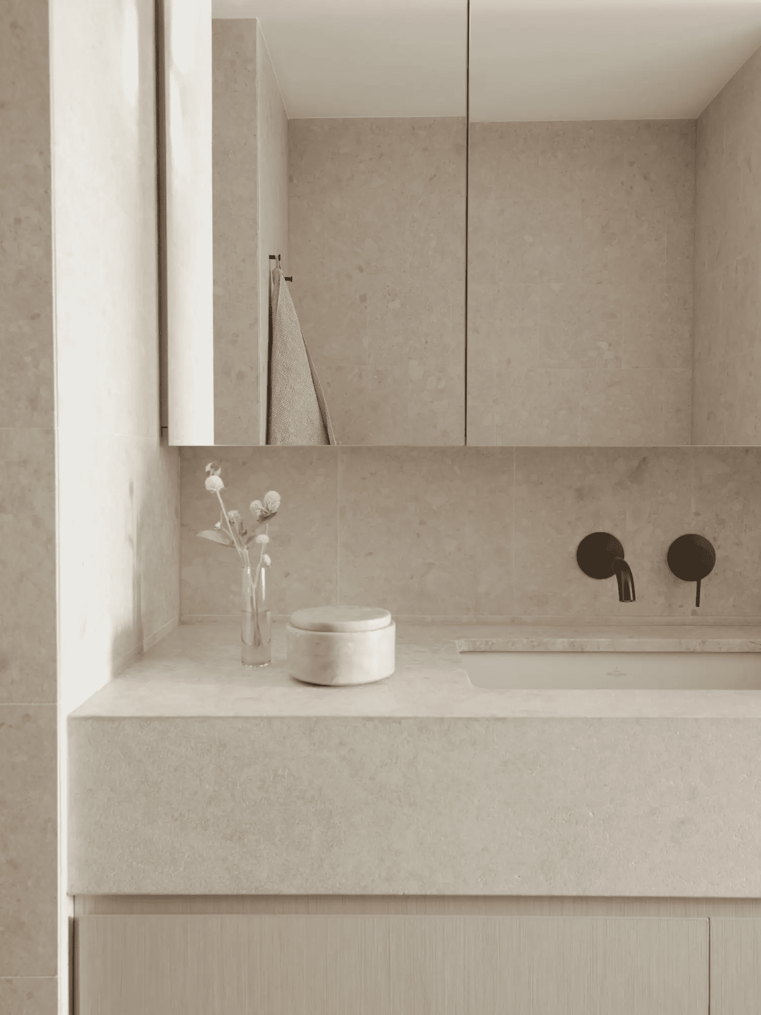 In terms of material and colour selection, the design team aimed to create a bright, light and timeless spatial atmosphere, allowing the external view to become the protagonist of the space. The foundational palette includes lime-washed oak herringbone parquetry flooring, Savannah marble benchtops, and crisp white painted walls.