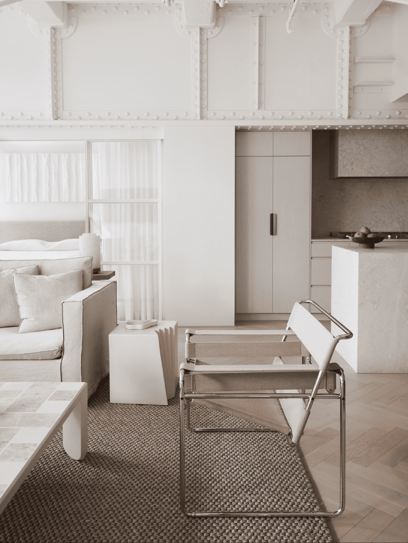 In the living area, a linen sofa, a Knoll Wassily chair in canvas and chrome, and a concrete coffee table are harmoniously placed atop a custom-made sisal rug. This juxtaposition of objects with different material qualities adds depth and interest to the space, all while maintaining an overall simplicity and cohesion.